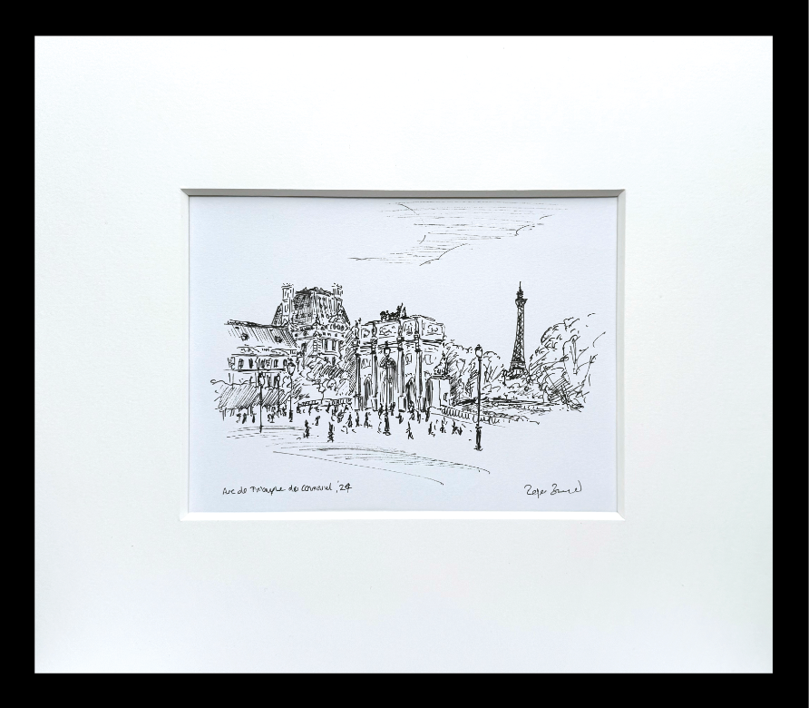 Discover the elegant grandeur of Napoleon's triumphal arch with this stunning original ink drawing of the Arc de Triomphe du Carrousel, the smaller but equally magnificent counterpart to the famous Arc de Triomphe, located in the courtyard of the Louvre Palace.