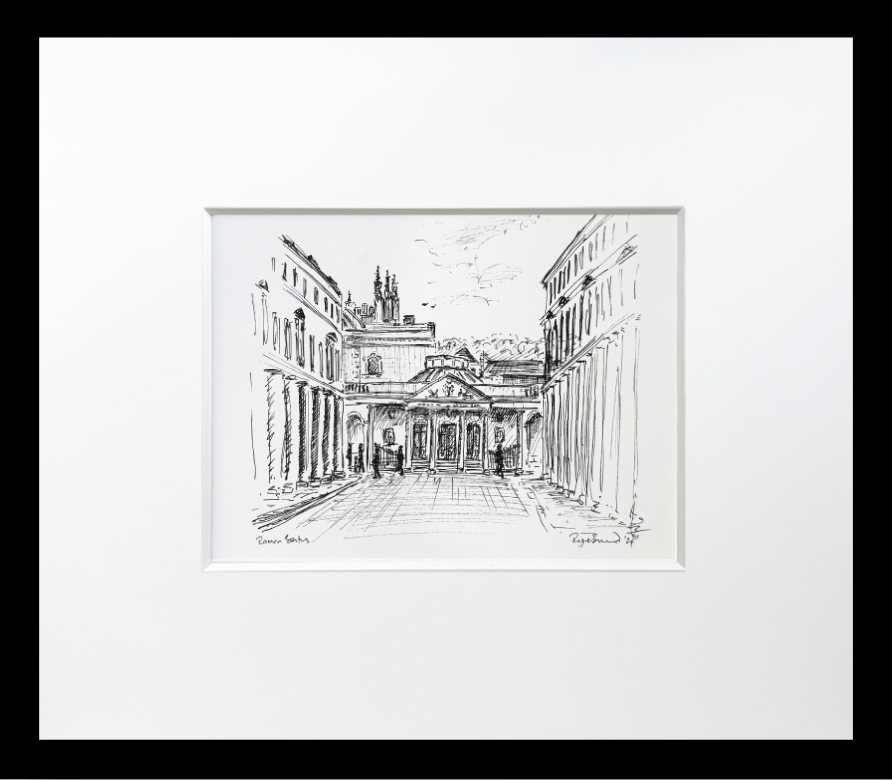 Step back in time with this captivating original ink drawing of the King and Queen's Baths, part of Bath's world-famous Roman Baths complex where natural thermal springs have flowed for over 2,000 years.