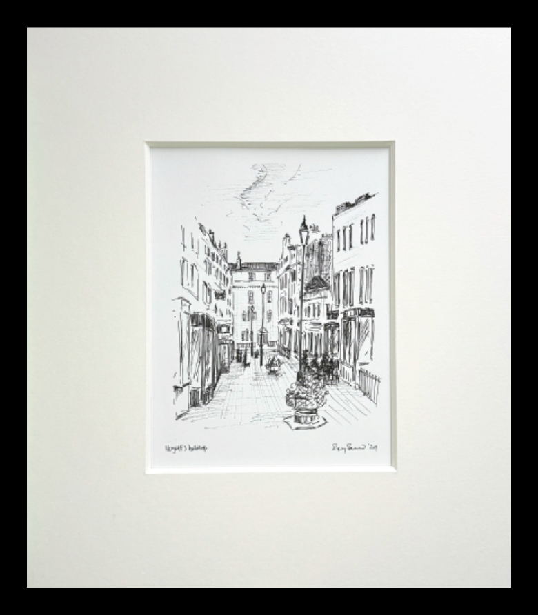 Discover the intimate charm of Bath's Georgian retail heritage with this exquisite original ink drawing of Margaret's Buildings, a distinguished address that exemplifies the refined elegance of this UNESCO World Heritage city's historic shopping streets.