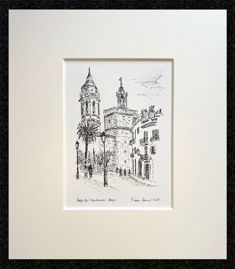 Capture the heart of Sitges with this beautiful original ink drawing of the historic Placa de la Ajuntament (Town Hall Square), the vibrant centre of this beloved Spanish coastal town.