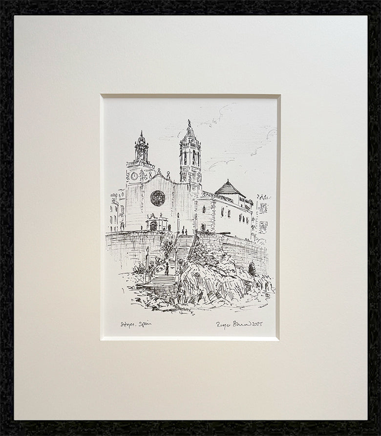 Experience the spiritual beauty of Sitges with this stunning original ink drawing of the Esglesia de Sant Bartomeu (Church of St Bartholomew), the iconic parish church that overlooks the Mediterranean from its hilltop perch.