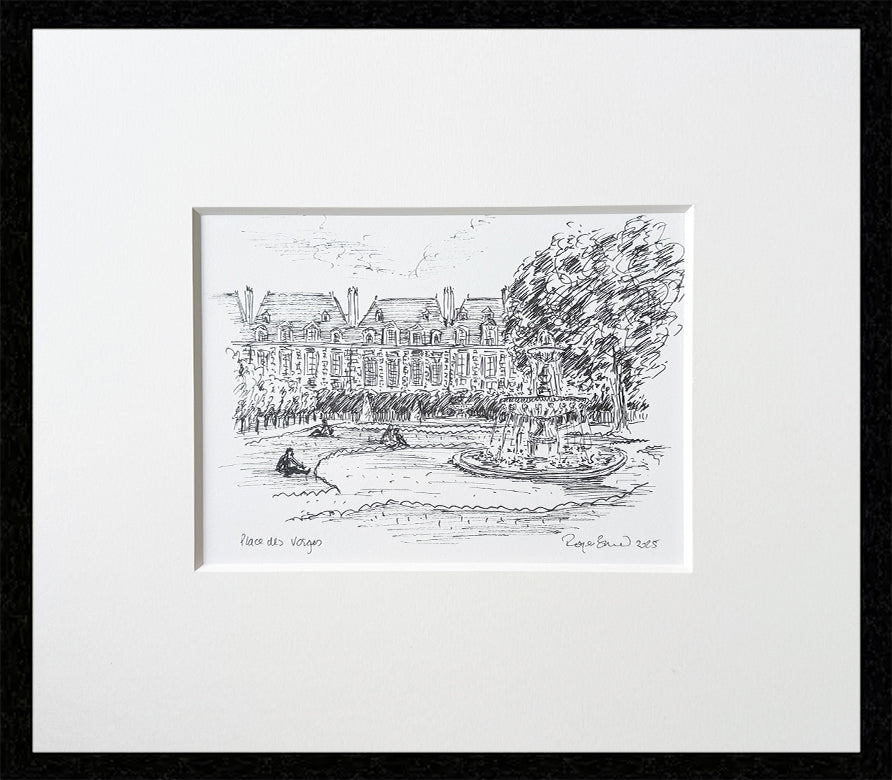 Experience the timeless elegance of Paris's oldest planned square with this magnificent original ink drawing of Place des Vosges, the jewel of the Marais district and one of the most beautiful royal squares in the world.